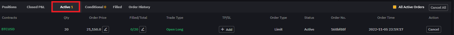 * 코인명은 BTCUSD이며, 롱 표시션으로 21,150달러, 수량 20개를 주문 → 미체결 주문내역