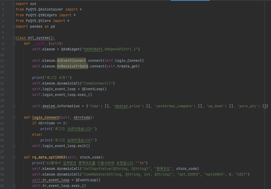 35줄 : 데이터를 수신받기 위해 임의의 trdata_get 함수를 선언한다.