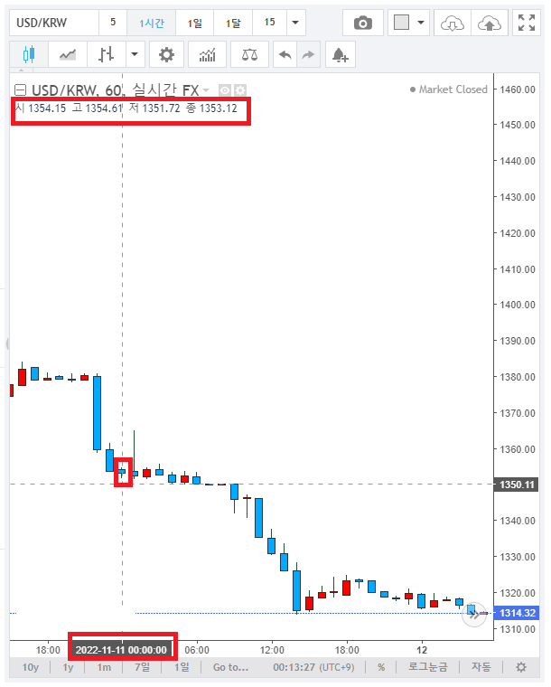 - 한국에서 적용되는 1일봉의 시작은 아침 09:00 ~ 다음날 09:00까지 24시간 거래가 이루어진다.