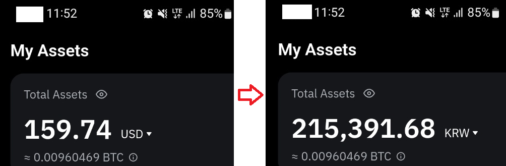<그림1>은 23:52분에 모바일에서 갭쳐한 0.0096 BTC에 대한 원/달러이다.
